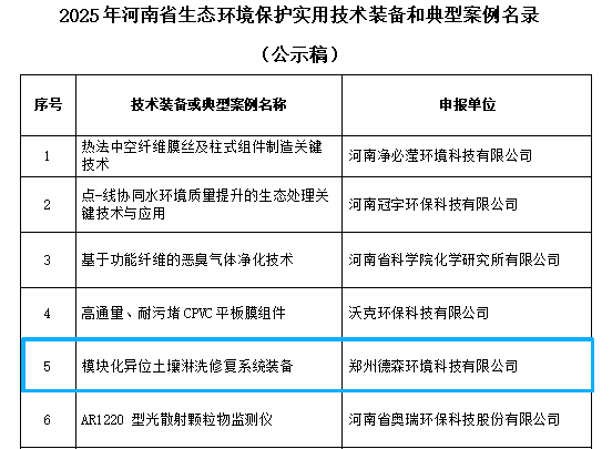 喜報(bào)!我司 “模塊化異位土壤淋洗修復(fù)系統(tǒng)裝備” 入選 2025年河南省生態(tài)環(huán)境保護(hù)實(shí)用技術(shù)裝備和典型案例名錄